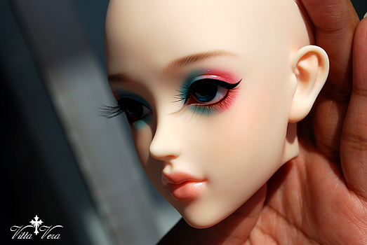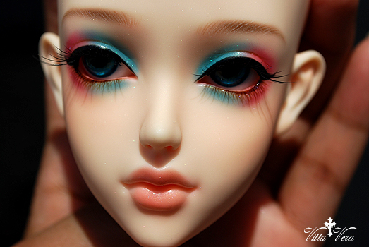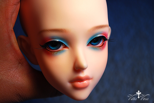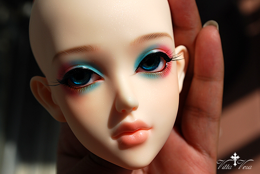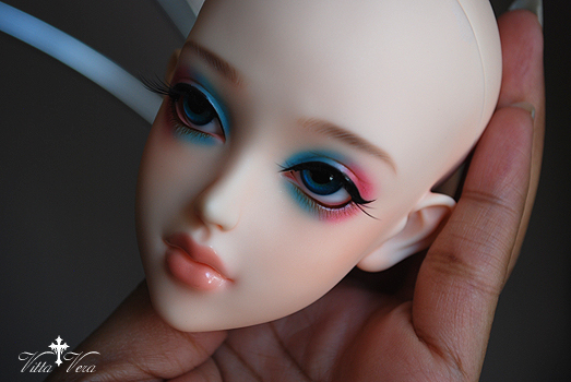 Notes: Owner wanted shimmery faceup with bold, saurated pink/aqua-blue eyeshadow, heavy black top liner and brown bottom liner/lashes, confident straight-across brown brows, peachy pink shimmery lips with no lip lines and blushing to match a company default blushed body; eyelashes provided by me