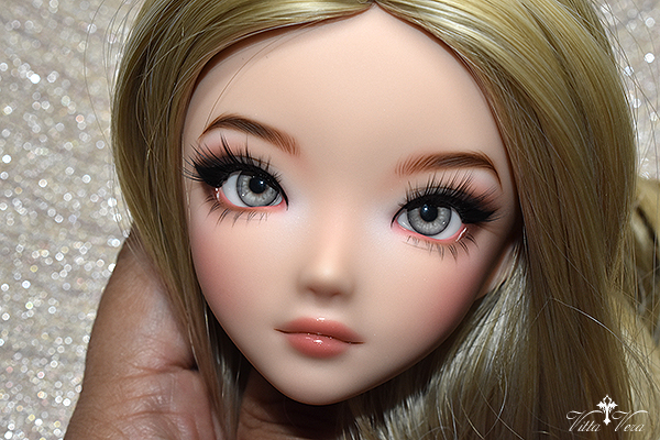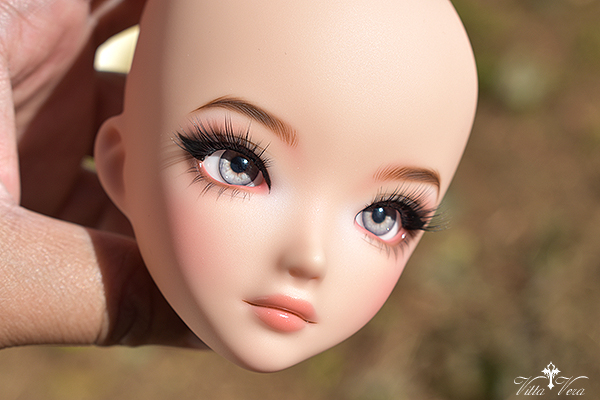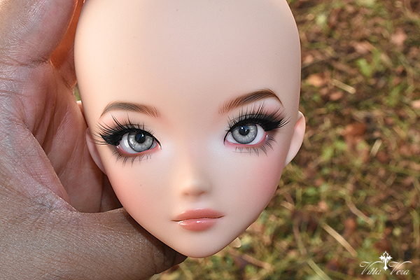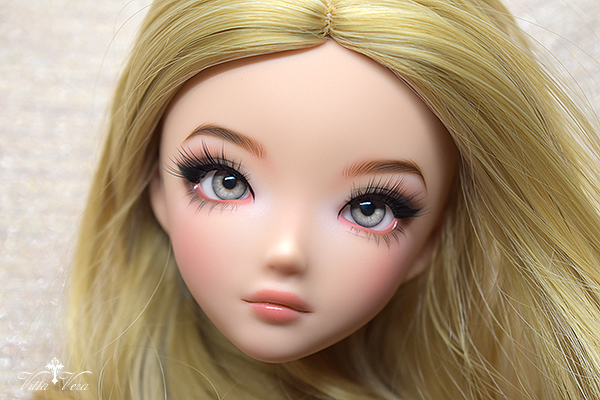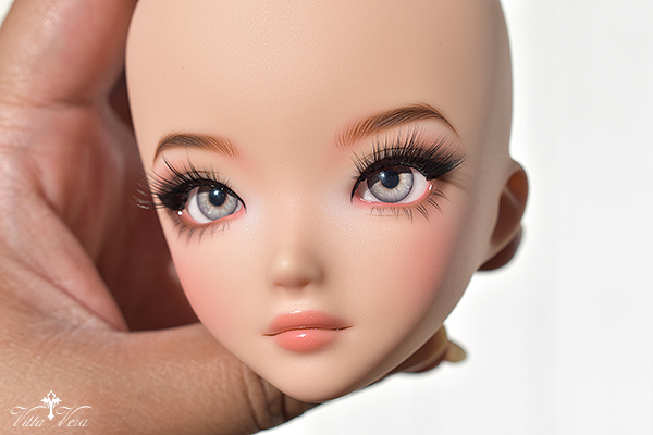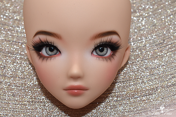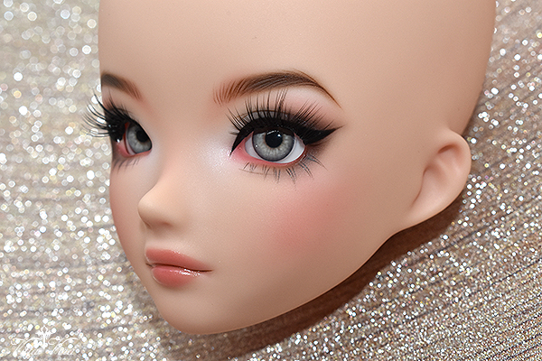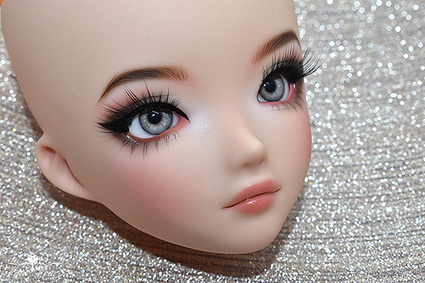 Notes: Owner wanted more BJD-style realistic faceup (as opposed to anime style) with referenced "daytime smoky glam" eye makeup with a bit of silver shimmer, arched brown brows, soft peachy blush and peachy pink lips; eyelashes provided by me