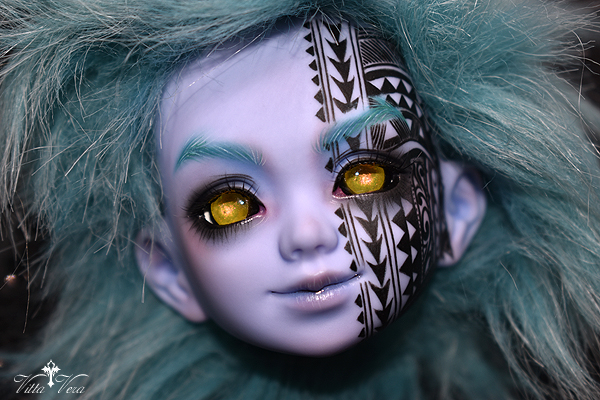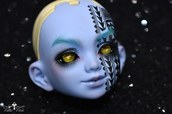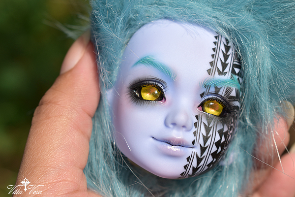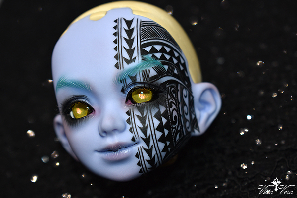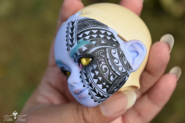Notes: Owner wanted faceup for a Hawaiian "Night Marcher" warrior spirit, with half-face tattooed in Hawaiian style (referenced and adapted), wig-matching brows and complimentary face; eyelashes provided by me