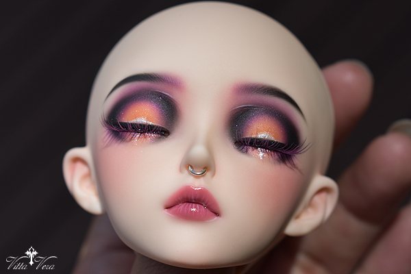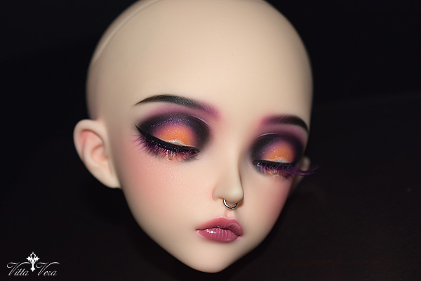Notes: Owner wanted jump ring septum piercing and faceup for a Twilight bird lady, with orange/black/purple shimmery circular smoky eye painted to evoke light reflecting on water, low, straight tapered brows in black/purple, vibrant violet-mauve lips and purple painted eyelashes to match applied lashes; eyelashes provided by owner